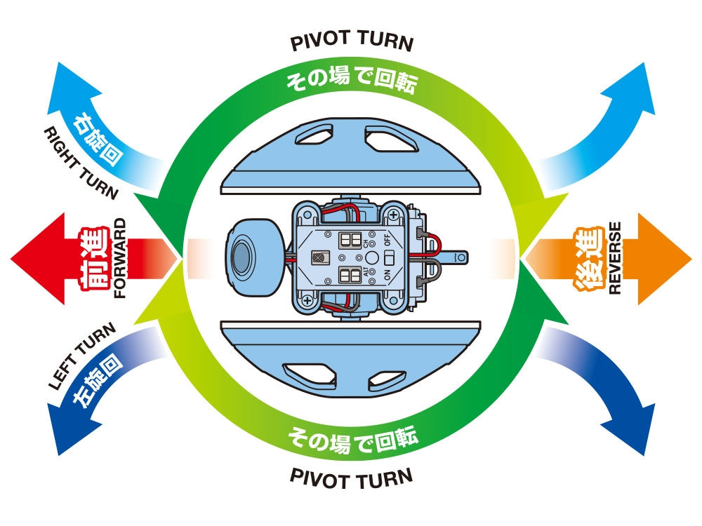 • Aziona questo Robot Rotolante con l'unità di controllo remoto a infrarossi inclusa (telecomando a infrarossi e ricevitore). Il robot ha un motore per ciascuna ruota, destra e sinistra, e offre i seguenti movimenti: avanti, indietro, svolte a destra e a sinistra e svolte a perno.